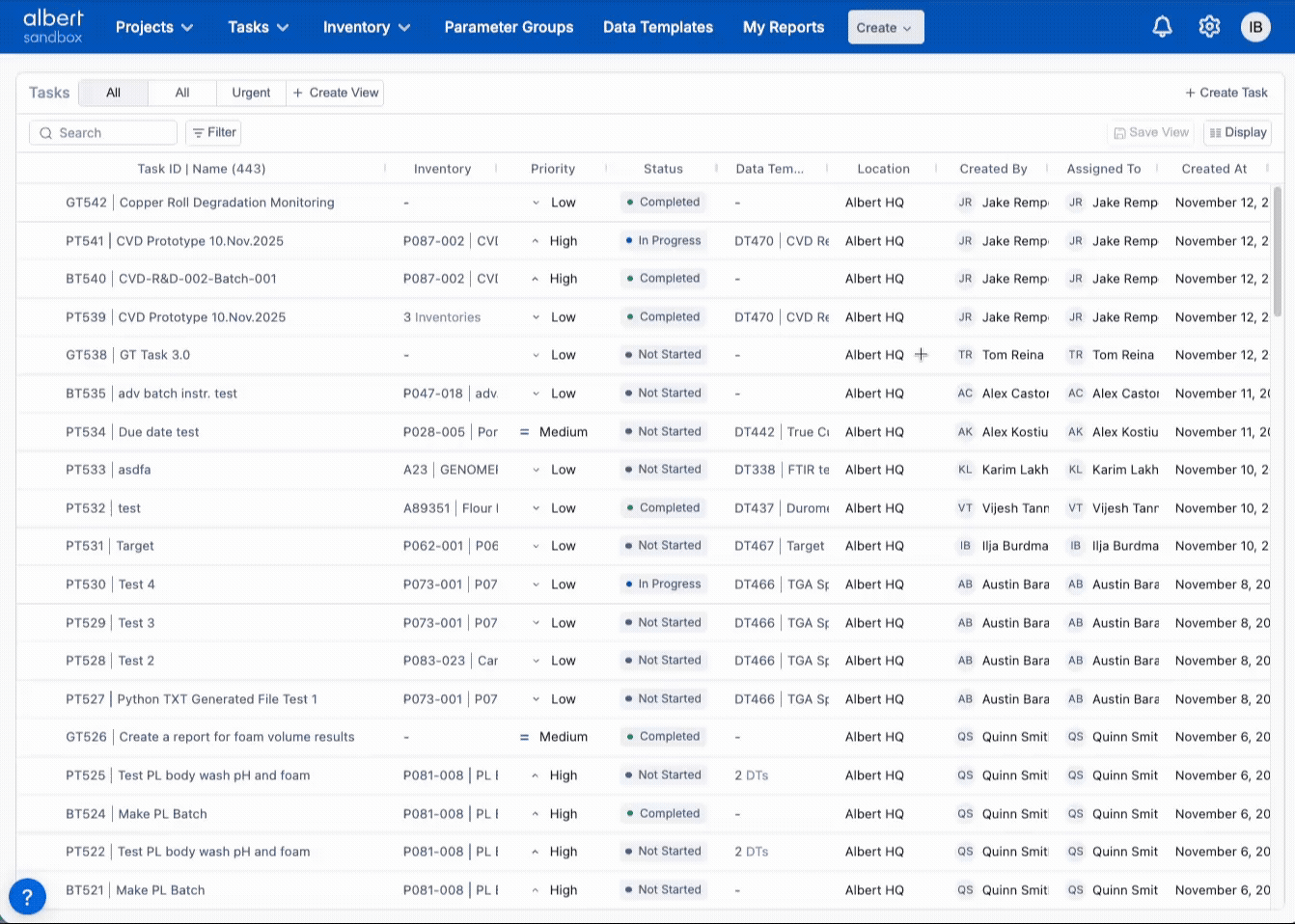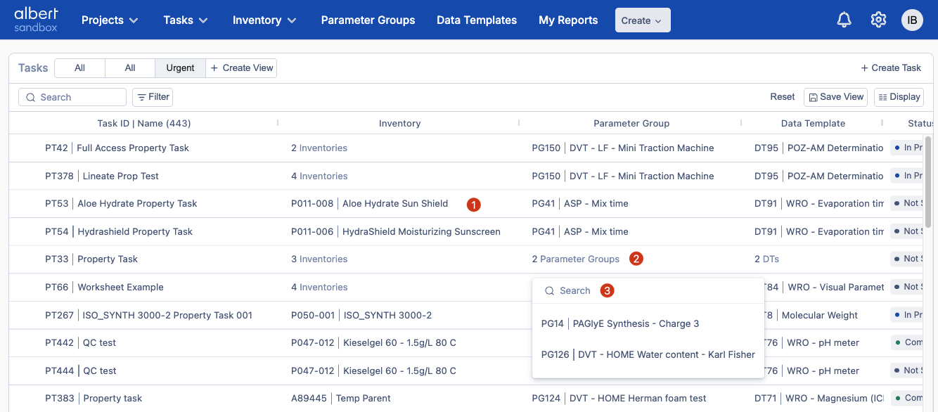 From Tasks, open related Inventory, Data Templates, and Parameter Groups directly from the grid.