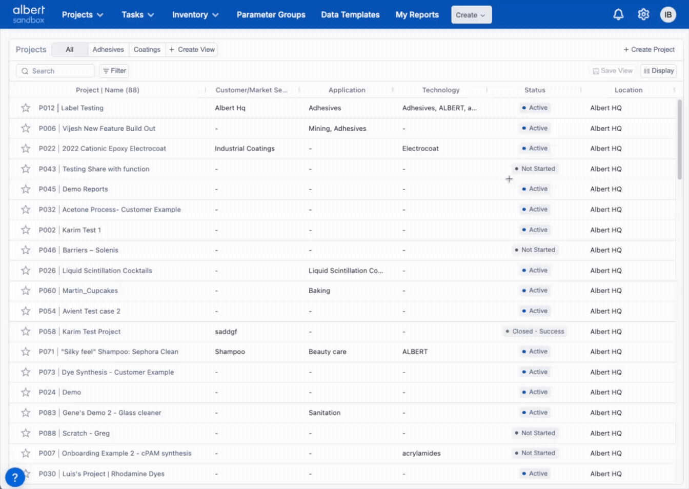 Projects: primary column is Project Name; click the Project Name to open.