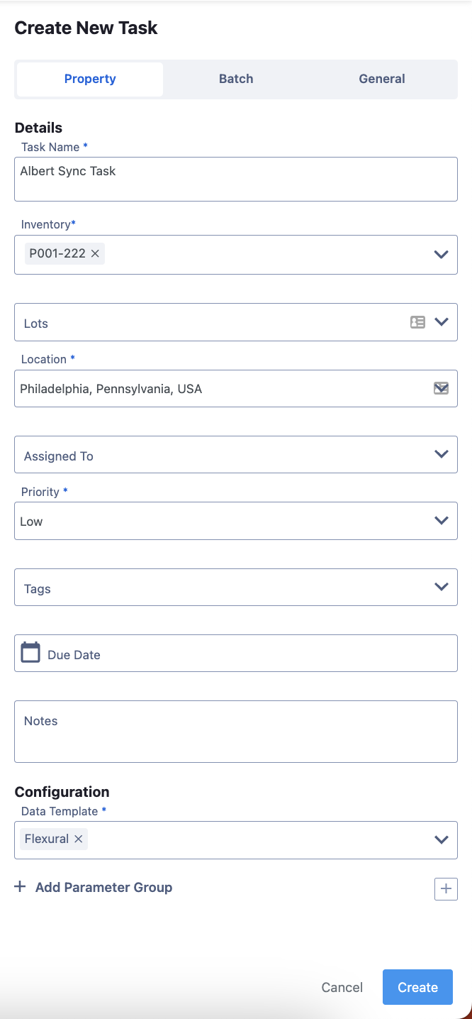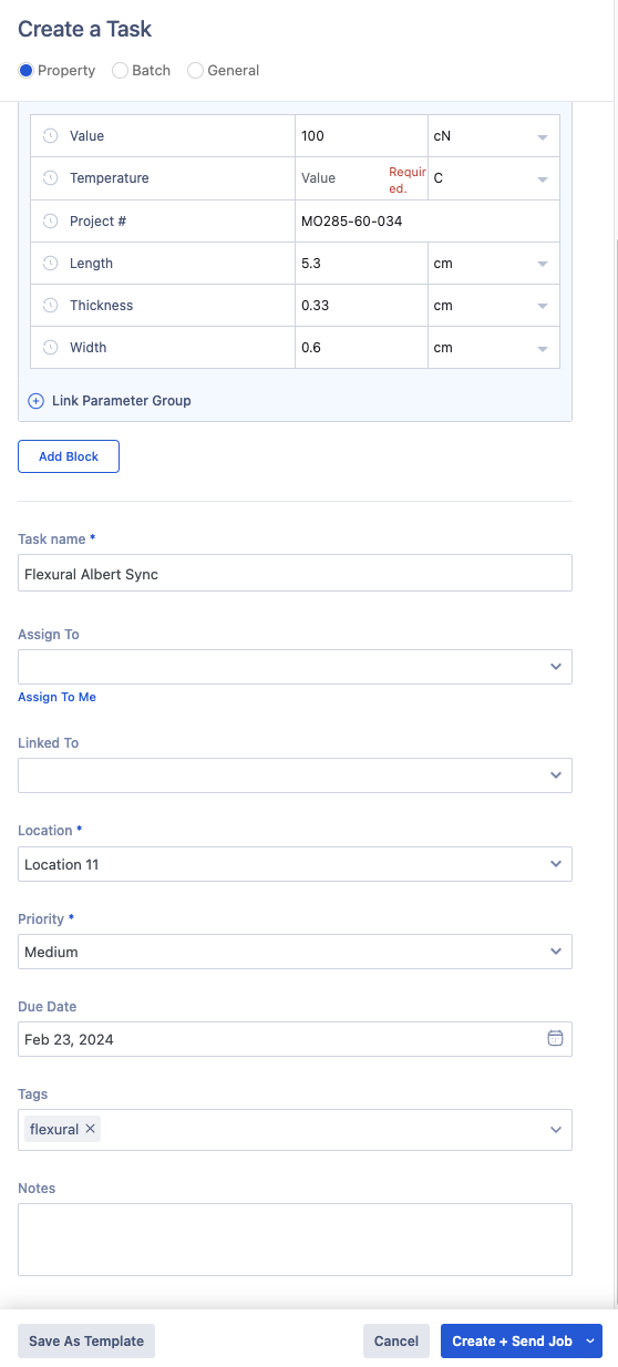 Once you've added all of your Smart Parameter Groups and have filled out all of the information about your Task, press the Create + Send Job button. This will send your Task to Albert Sync, where it will wait in the queue.