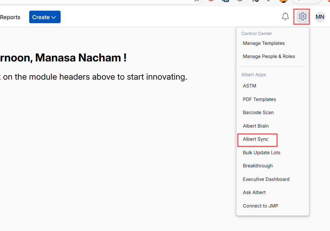 Albert Sync not visible in menu | Access permissions missing | Contact your Albert Administrator to request access |