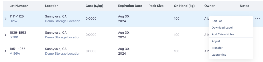 And a number of actions can be taken against the Lot from this view, including downloading the label, transferring the lot to a new storage location, changing the quantity, and editing the Lot: