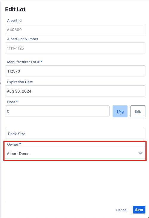 Each Lot must be assigned an Owner (see image below). This is a required field and must be filled out upon Lot creation, and it can be edited later as needed.