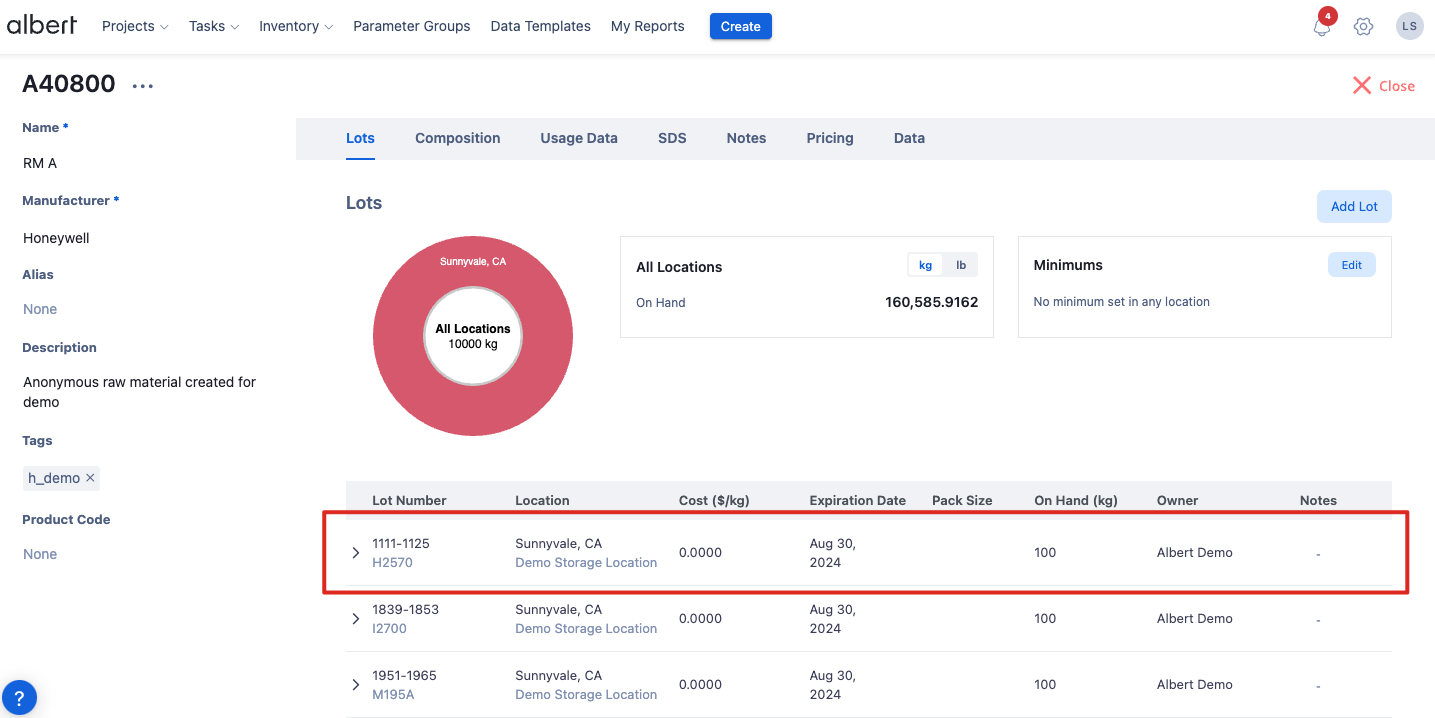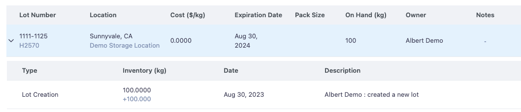 Lots of Inventory items are the physical representation of Raw Materials, Formulas, Consumables, and Equipment in your laboratory. On the Inventory item's page, each Lot is represented by a row like shown below: