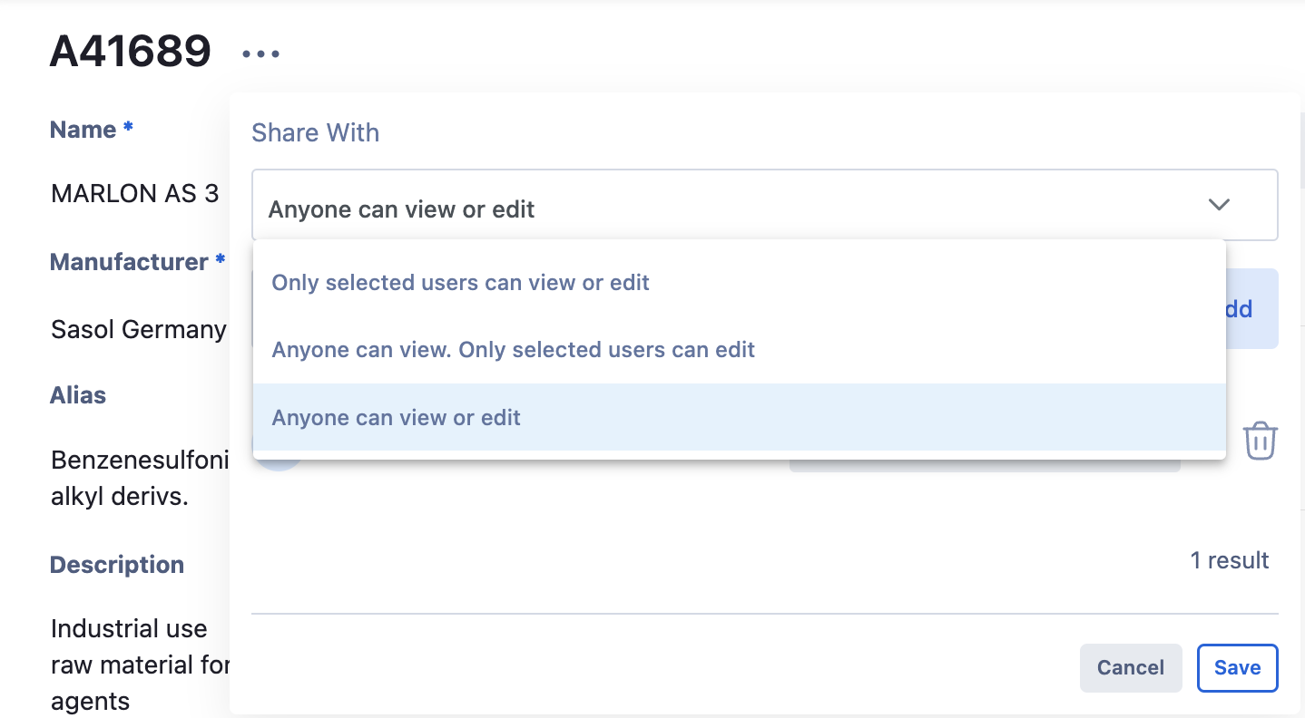 Note: Only users with appropriate permissions will be able to update the Inventory's access. If you'd like to update an Inventory item but are unable to, please reach out to your organization's Albert administrator.