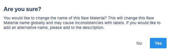 If you attempt to change the name of the Inventory item, Albert will ask you to confirm, as changing the name of the item may cause inconsistencies with any labels that have already been printed and reference the Inventory item. Click "Yes" to confirm.