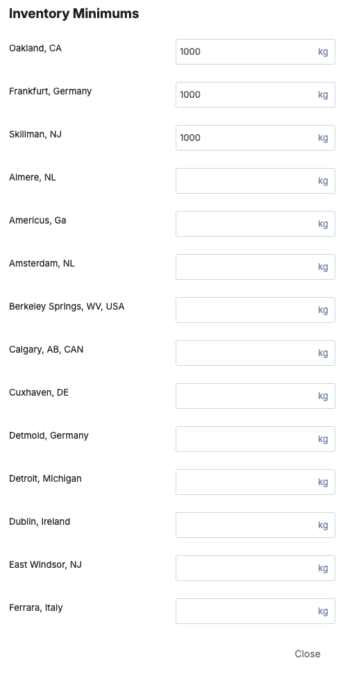 4. A side popup will appear. You can scroll through the available locations and enter the minimum inventory level for that location. Enter the value and click on the Close button.