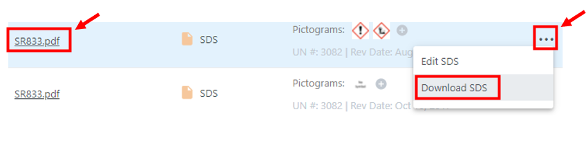 Either click on the SDS file name, or the menu button and select "Download SDS" in the dropdown.