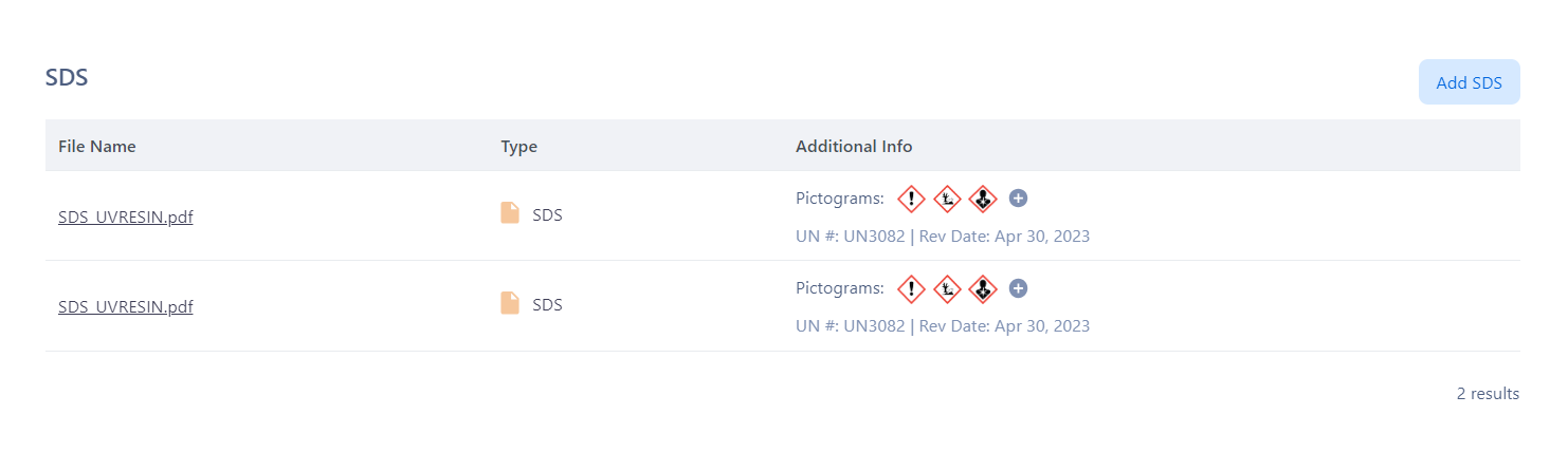 The SDS section allows you to add Safety Data Sheet (SDS) documents directly to a Raw Material and Consumables. You can also view and edit any previously uploaded files.
