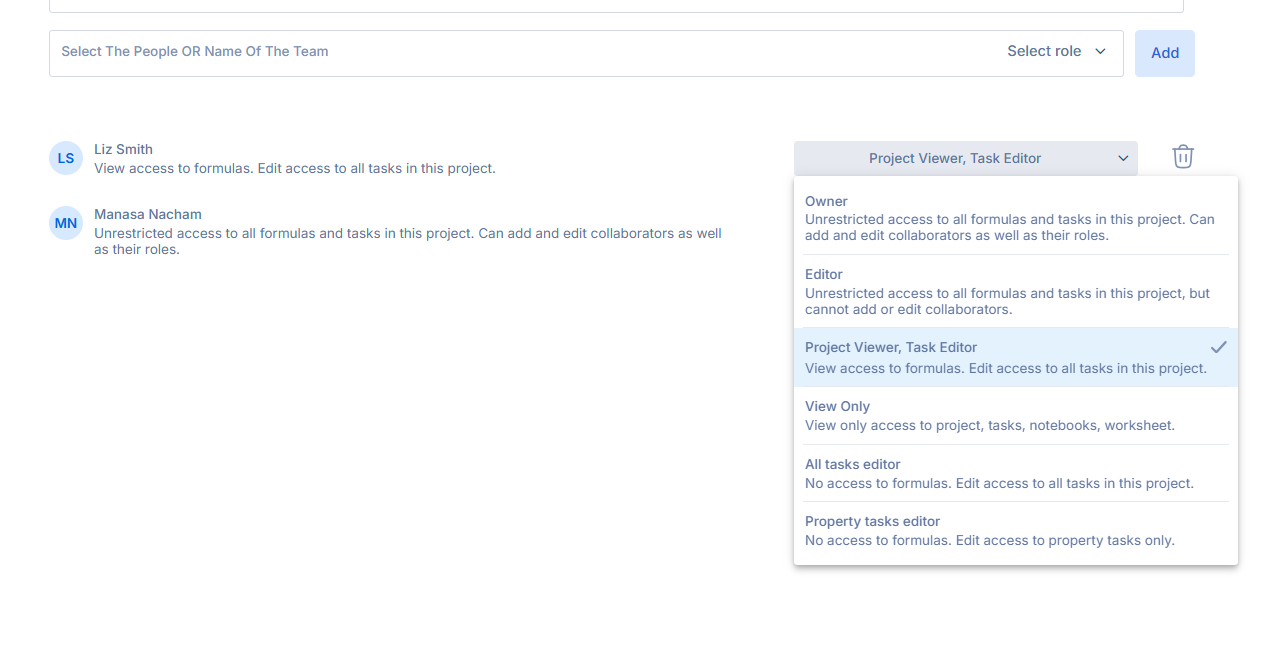 Owner - The Owner has full access to the Project and is the only user who can add users to the project or update the user roles. The owner can view and edit the Project details, worksheet, and tasks within the project.