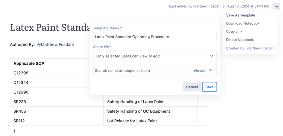 Finally, select who has Viewer or Owner access. Depending previous selection for “Share With”, defining Owners will allow specific users the ability to edit and modify the template in the future. Viewer access will grant access to view and select the template but will keep Viewers from making any modifications to the template. Viewers can still add to their own Notebook, but will not be able to adjust the base template format for future users.