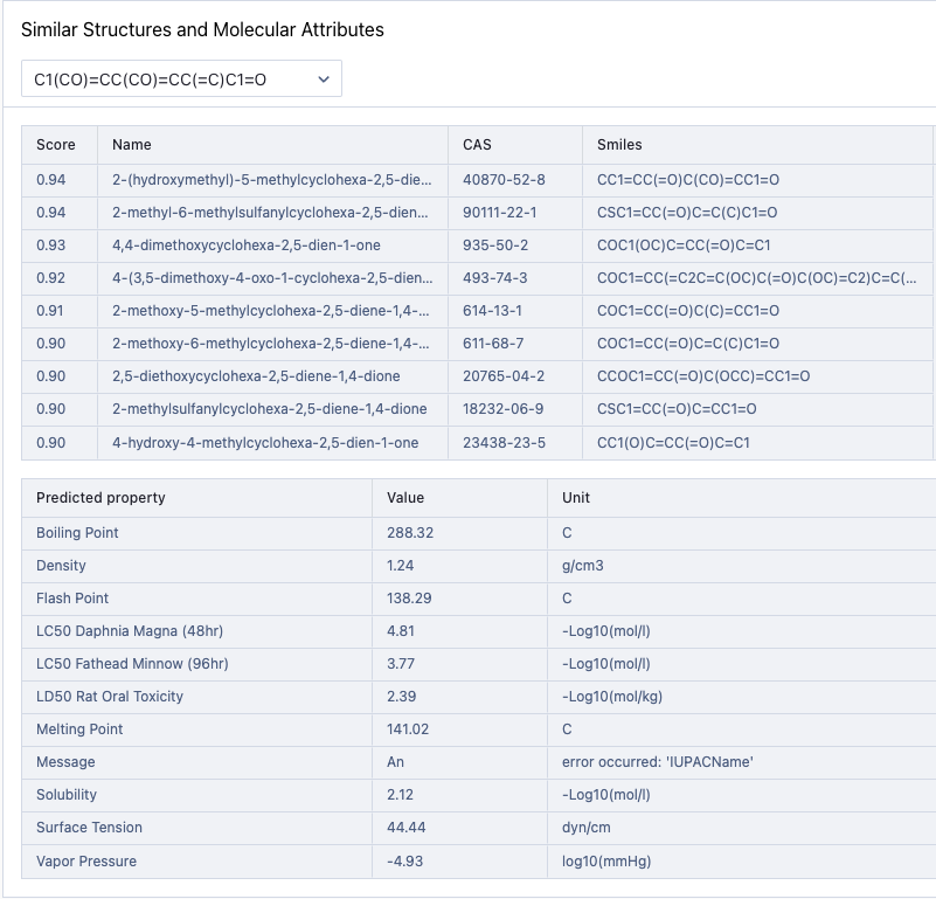 An additional table will show the predicted properties, value, and units of your structure. This table can be used to find similar alternatives to chemicals used in your workplace: