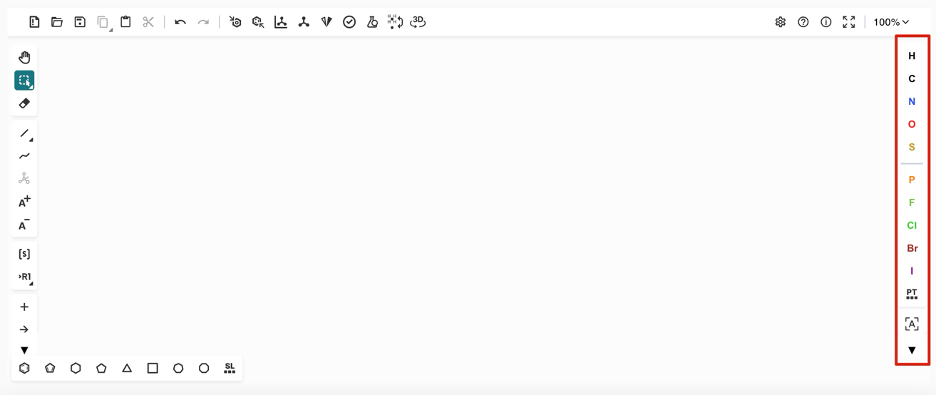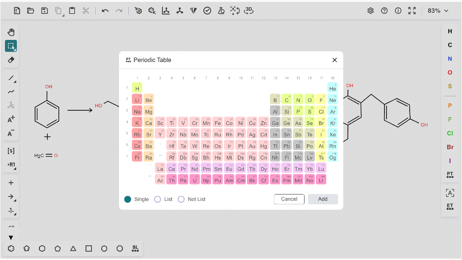 The tool menu on the right allows for the addition of elements outside of the listed elements. You can manually select an element from the periodic table, or use an extended periodic table which attaches commonly used functional groups.