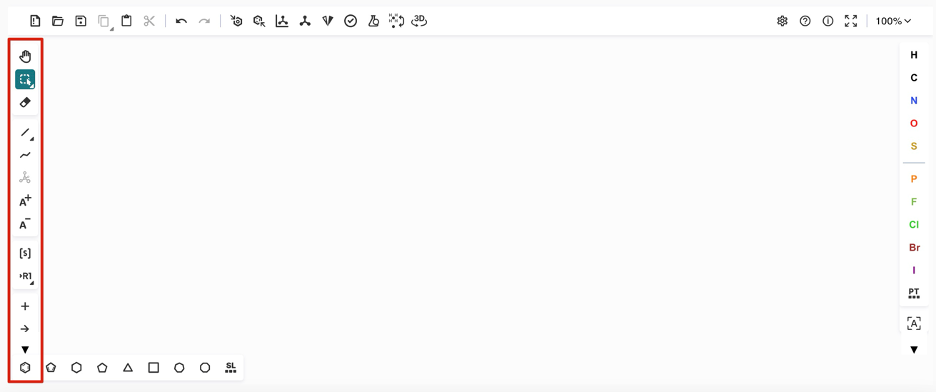The menu on the left of the screen allows you to navigate your chemical drawing, create bonds, link charges, and add in text or arrows to display in a reaction.