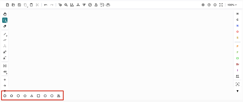 Selecting any molecule from the template library, functional groups, or salts and solvent will bring the selected molecule into the Chemical Draw dashboard to be added as a new or existing structure.