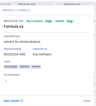 The Expand Summary functionality can be used to open a pop-up within the worksheet displaying information about the selected Formula / Product. Clicking "Open Details" at the bottom left of the pop-up will open the entire inventory page in a separate tab so you can look at existing lots, advanced batch instructions, SDS information, notes, or any tasks that have been linked to the selected Product / Formula.
