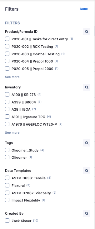Filters down to products / formulas that have tasks created for specific data templates.