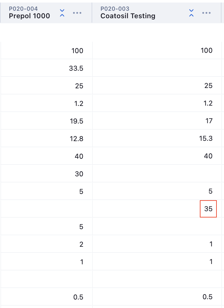 As you can see in this example, the highlighted cell is added when both Prepol 1000 and Coatosil Testing are Focused since there is a value for the Inventory item in the Coatosil Testing column.