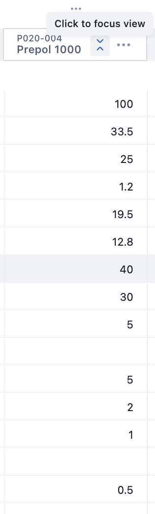 Selecting the Focus View function for a Product or Formula in your Worksheet allows you to hide rows without values, only displaying rows with values for that column in your Worksheet. Note: row group parent rows will show up in Focus View.