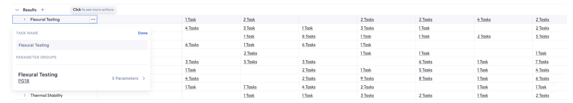 In the Results grid, the parent row displays the task name and encompasses all parameter group details. Click the icon next to the task name to see more actions. Click Expand Summary to quickly see the parameter groups, parameters, and values of the row.