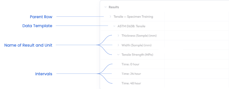 View the data templates results (or data columns) and intervals by expanding the parent row. Any data input in the Results Grid stays anchored to these attributes.