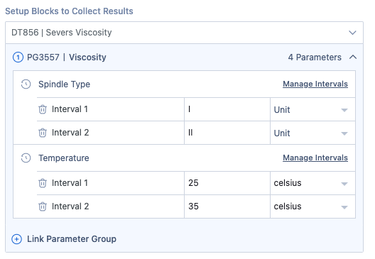 While performing a Property Task, Albert allows you to collect data for different intervals of one or two parameters in a Parameter Group. This function allows you to create a lot of data without making a different task for each interval.