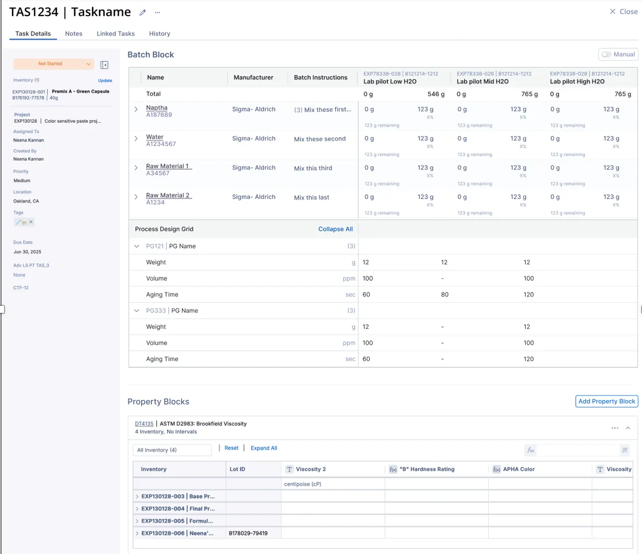 You can still use standalone Batch Tasks or Property Tasks when that better fits your process (for example, testing an existing stock batch). Connected tasks are ideal when “make + test” clearly belong to the same experiment.