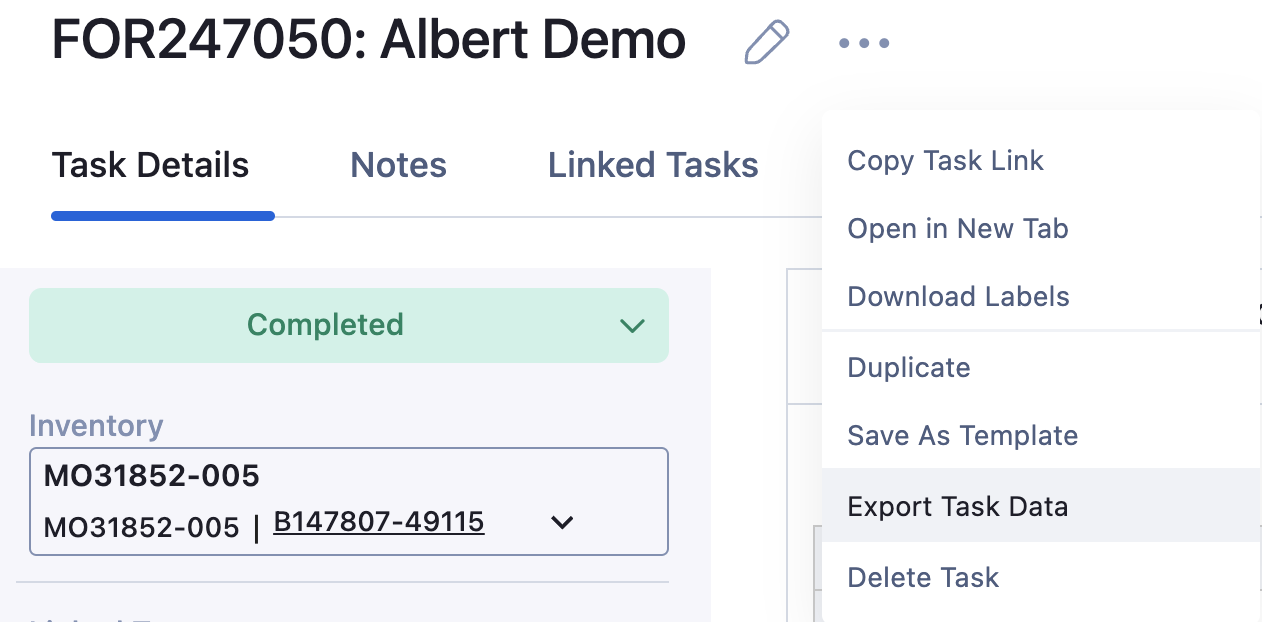 To export Property Task Data - navigate to the property task and click on the 3 dots for menu options. Select "Export Task Data".