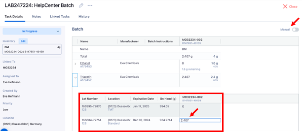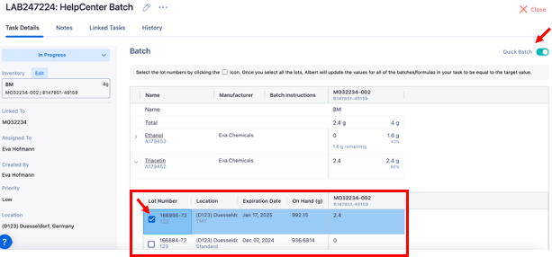 Define the quantity of the raw materials used for the batch within the Batch Task. For this purpose, open the raw material's drop-down menu. All available lots at your location will be displayed. You can define the quantity used either manually or using the Quick Batch option.