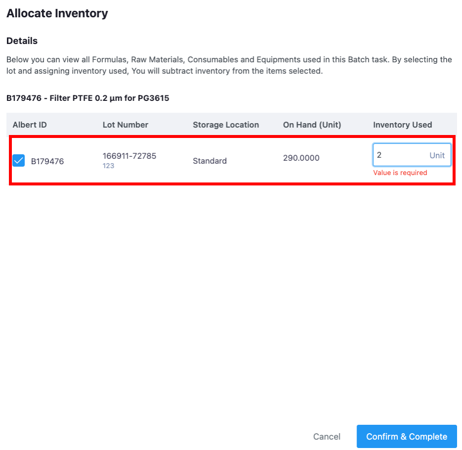 When you complete the Batch Task, the Allocate Inventory pop-up will appear. Select the inventory items you used and set the quantity you used. Click "Confirm & Complete".