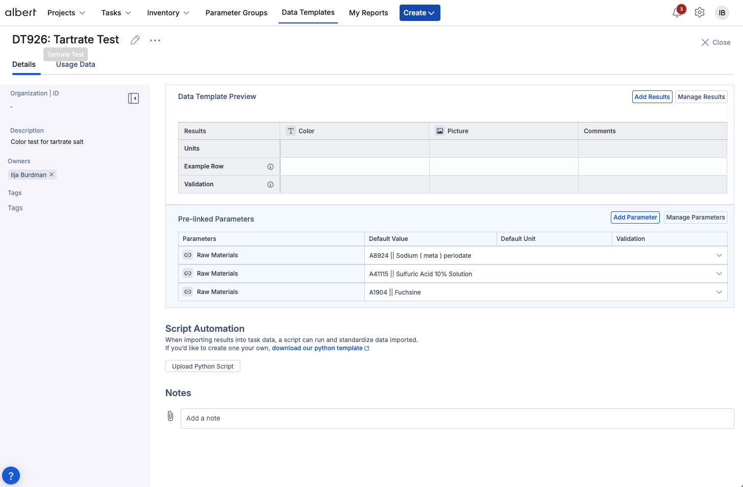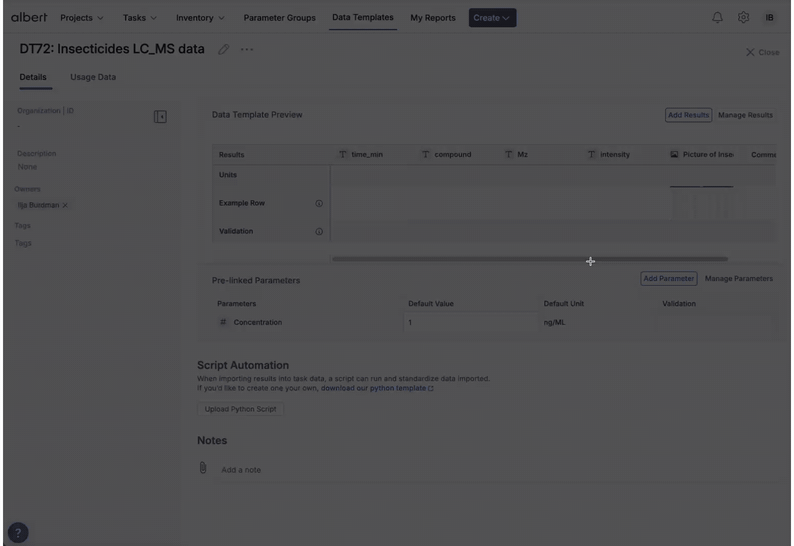 Data Templates define how results are captured and structured in Albert. This article explains what Data Templates are, when to use them, how to create and configure them (including units and validation), how to connect them to scripts for automation, and best practices and troubleshooting tips.