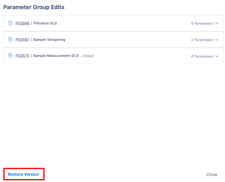 The restore version also works if multiple changes to Parameter Groups were made (i.e. additional Parameter Groups were added after Task creation). Following the same process, the user can restore the Parameter Groups to any previous configuration from the Version History.