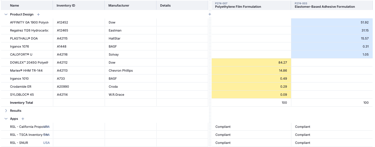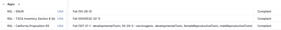 Note: For the TSCA 8(b) App Row, the functionality simply lists if your ingredients are listed on the TSCA 8(b) inventory. Please confirm your ingredients are ACTIVE on the inventory.