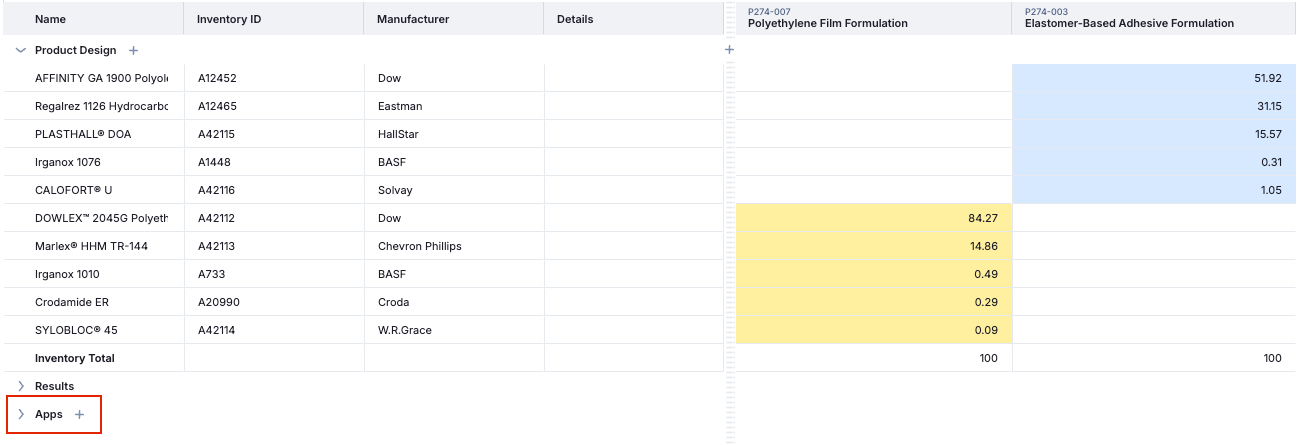 After each change to the formulation , the App Rows will flash green, indicating a refresh of the calculation to ensure any new inventory changes will also be checked.