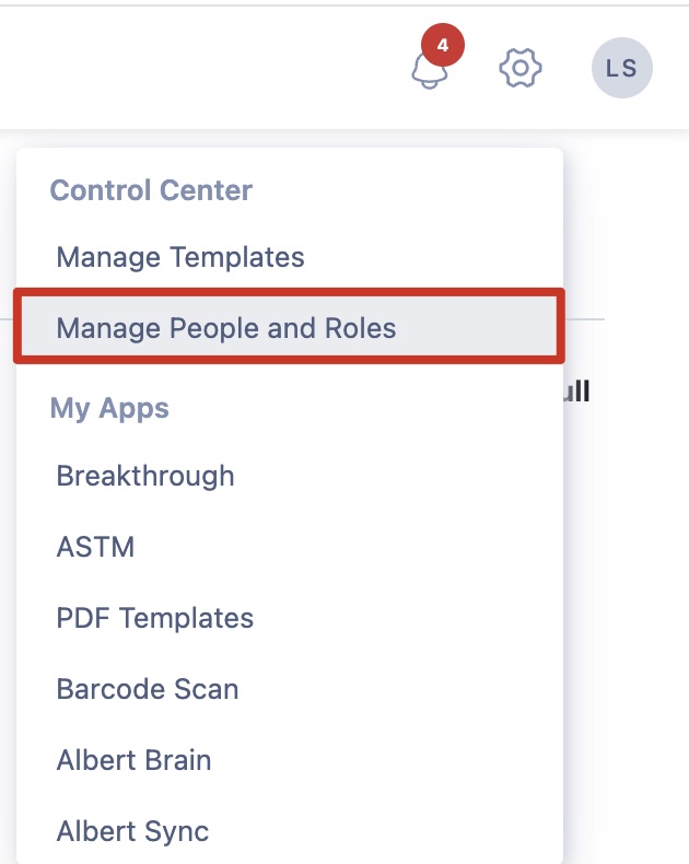 The Roles available for your Albert environment can be found by navigating to the Gear icon and selecting Manage People and Roles.