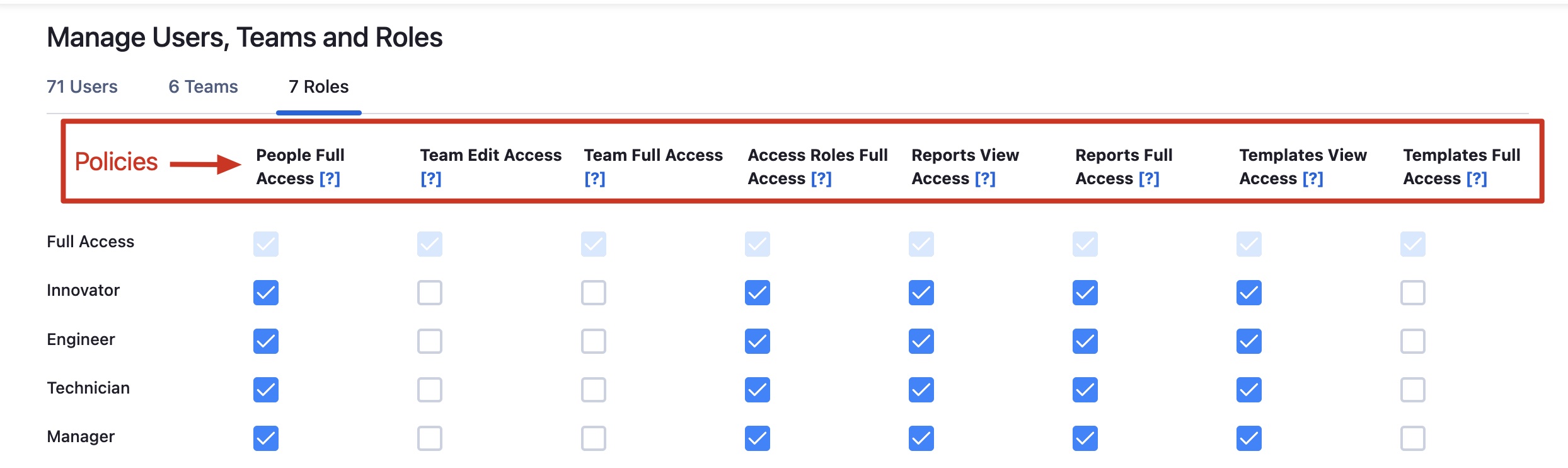 Once you're in the Manage Users, Teams, and Roles page, click on the Roles tab. From here, you can view all of the Policies available, as well as all of the Roles created.