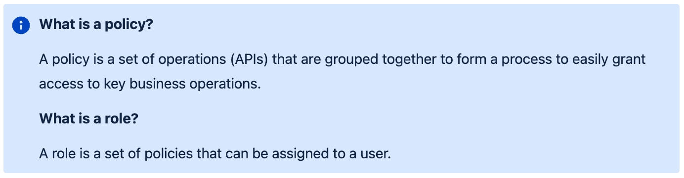 Roles are user types that are customized by each organization. Each Role represents a unique combination of access to certain Policies, which are a list of operations that a user can perform (APIs that a user can call).