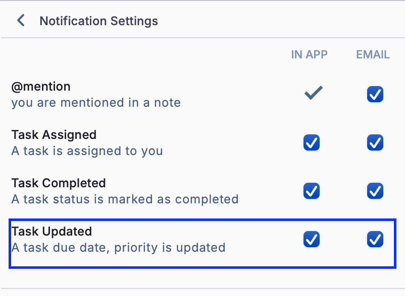 Example: To receive email notifications when a task is assigned to you but not in-app notifications, check the Email box and uncheck the In-App box.