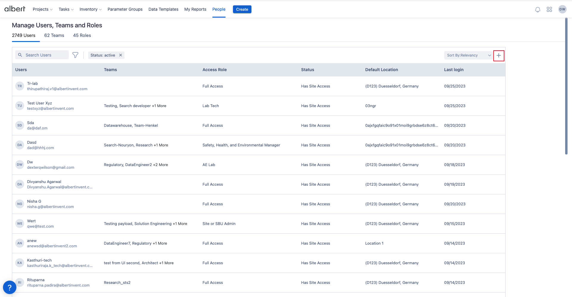There are two ways to create Users in Albert. The first way is using the Create button. The second way is by using the + icon in the Users tab in the People module.