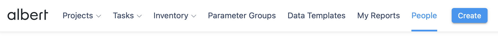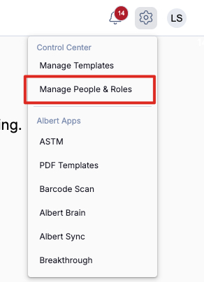 To create a new User from the Create button, navigate to the Manage People & Roles section from the Gear menu in the top right of your Albert screen.
