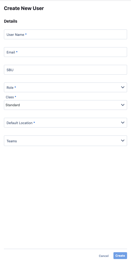 Either of these actions will open the Create New User modal. From there, you can fill out the user's information including their Name, Email Address, Role, Class, Default Location, and Team(s) that they are on.