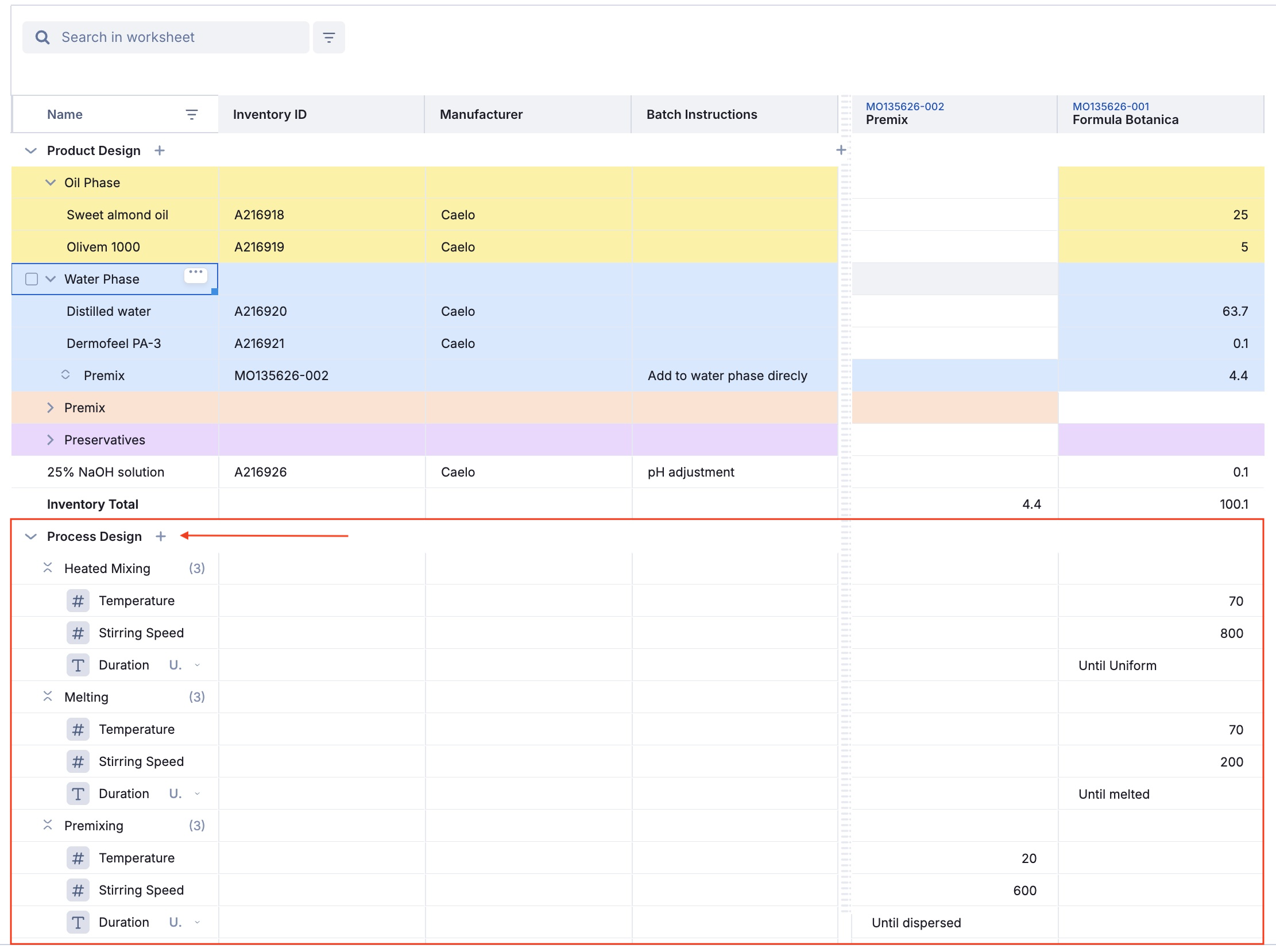 This article explains how to prepare your product in the Worksheet, define parameter groups in the process design grid, and then adjust those parameter groups in Inventory so they reflect the actual process instructions for the formula.