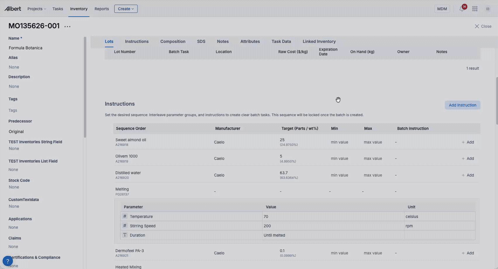 Learn how to align ingredient addition order with your process design steps in Albert. This setup helps you organize ingredients according to the actual manufacturing sequence, define parameter groups in the process design grid, adjust them in Inventory, and then view the final sequence in a Batch Task.